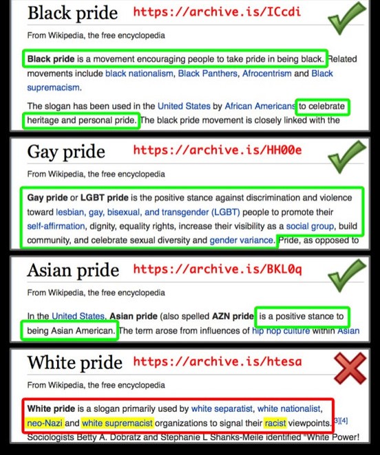 Men om du söker på ”white pride” kommer du genast mötas av beskrivningar som handlar om hat, extremism och förtryck. Samma dubbla måttstockar ser man vid sökningar på vit nationalism jämfört med exempelvis indisk nationalism eller kinesisk nationalism.